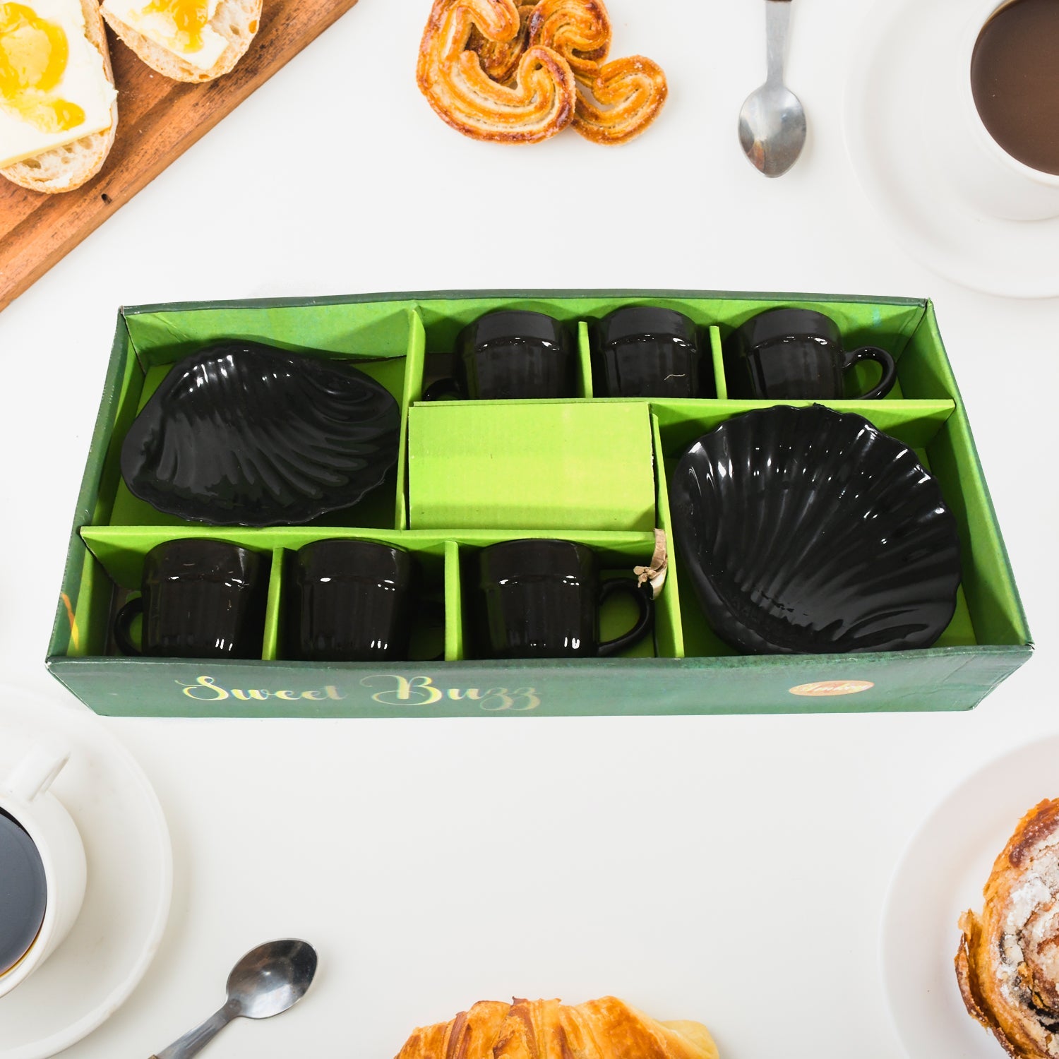 8237 Sweet Buzz Ceramic Tea / cups / Mug Set With Seashell Shape Serving Bowl Milk Cup, Coffee Cup, Tea Cup, Breakfast Cup, Drinking Mug or Outdoor for Household, Gift for Birthday, Wedding Party (8 Pcs set)Description :-6 pcs Ceramic cup & 2 pc Plastic bowl 8-piece set of seashell bowls and cups. Made from durable ceramic cup & plastic bowl, these stunning pieces are the perfect addition to your collection. Serve up your favorite snacks and drinks in style and impress your guests with their unique design.